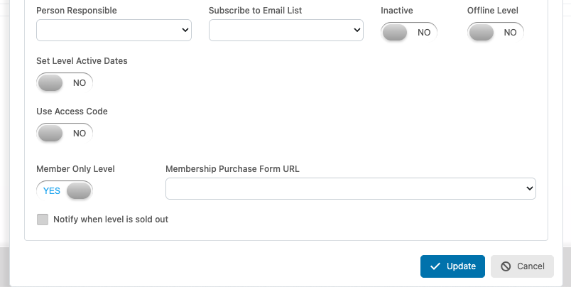 - Set Level Active Dates - Enter in a date range for when this level should appear active and available for registration and when it should become inactive and hidden from the form.