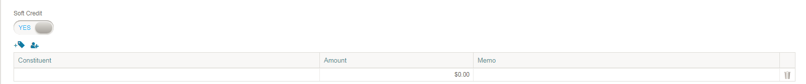 To delete a row on the soft credit grid, click on the trashcan icon in the last column on the grid for the row that you would like to remove. If you need to give soft credit to a constituent that is not yet in AssociationSphere, you can click on the “Add Constituent” button that is under the Soft Credit button. Once you enter the constituent information, they will be available in the dropdown box in the new row under the Constituent column.