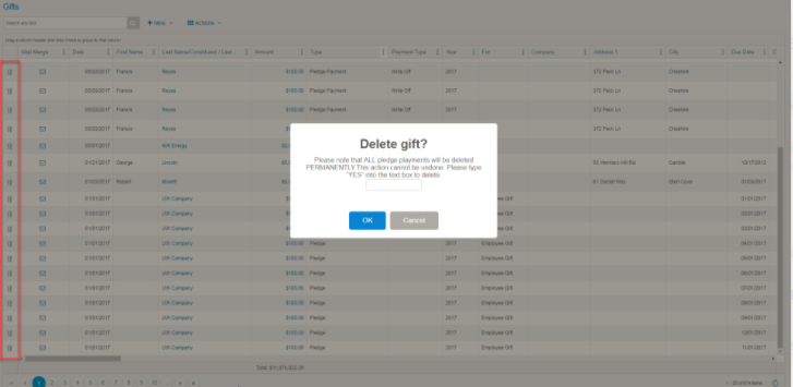A pledge can be deleted from the Transactions Grid (not the Pledges Grid) by selecting that specific pledge and clicking on the trash can which is located on the far left side of the grid. You will get a confirmation message asking you to confirm that you really want to delete the pledge. You can cancel or continue and the pledge will be deleted. All pledge payments and any other payments due for that pledge will also be deleted.