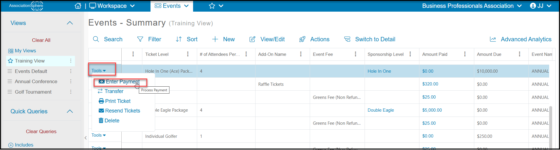 Once the invoice has been deleted, you can manually record a payment using the Events grid or the constituent's Events tab. From the grid, select the row, click on Tools on the left side of the row and select Enter Payment.