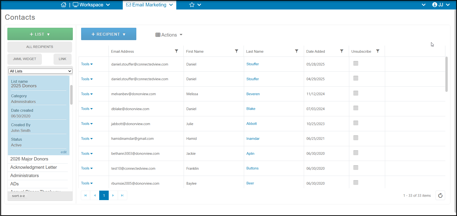 The Contacts Page in the Email Marketing Module is used to manage all of your email lists and the contacts on those lists. Contacts are the constituents who will receive the emails sent to those lists. All of the contacts shown in the contacts page are also constituents in the database.