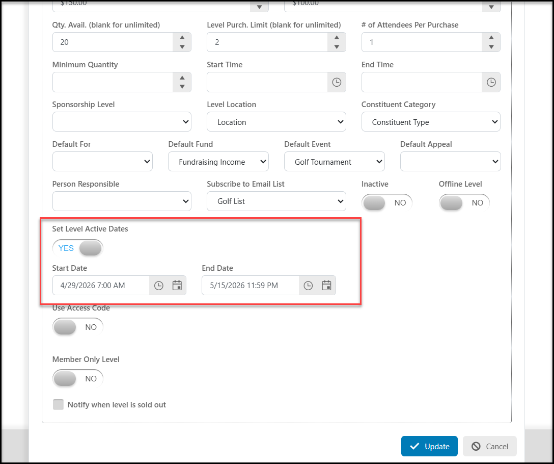 - Switch the Set Active Level Dates toggle to Yes.