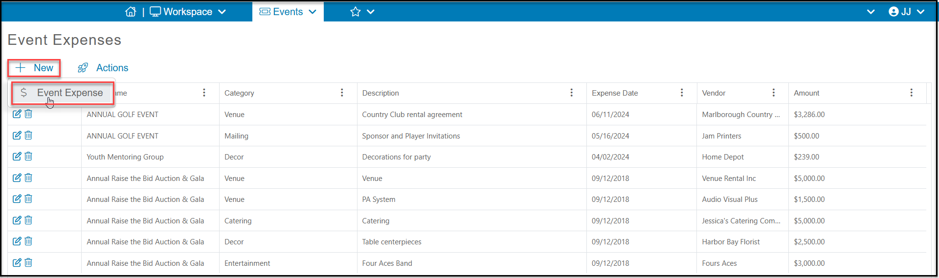 The grid does not interface with the Gifts grid, so these expenses are not recorded with other financial data and it is not available for QuickBooks export. You can add a new expense to the grid by clicking on +New, then Event Expense.