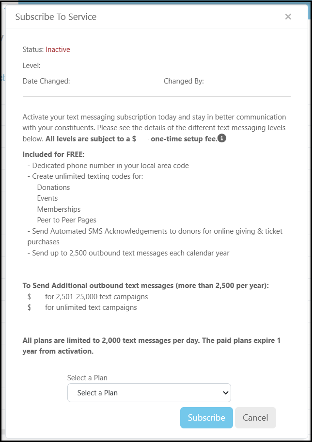 If text messaging is not yet active, you can click on the pencil and paper icon next to Inactive to open a new window with your subscription options.