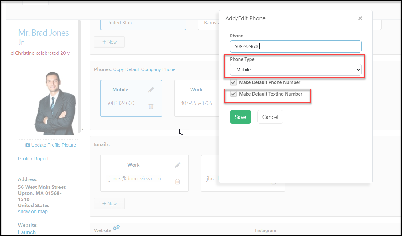 In order for a constituent to receive a text message from the software, they must have a phone number identified as a “mobile” phone number. The messaging service will not send text messages to phone numbers identified as Work, Home, or other labels. If the constituent has multiple Mobile phone numbers, you can select which will be used as the default by checking the box Make Default Texting Number for that phone number in their record.