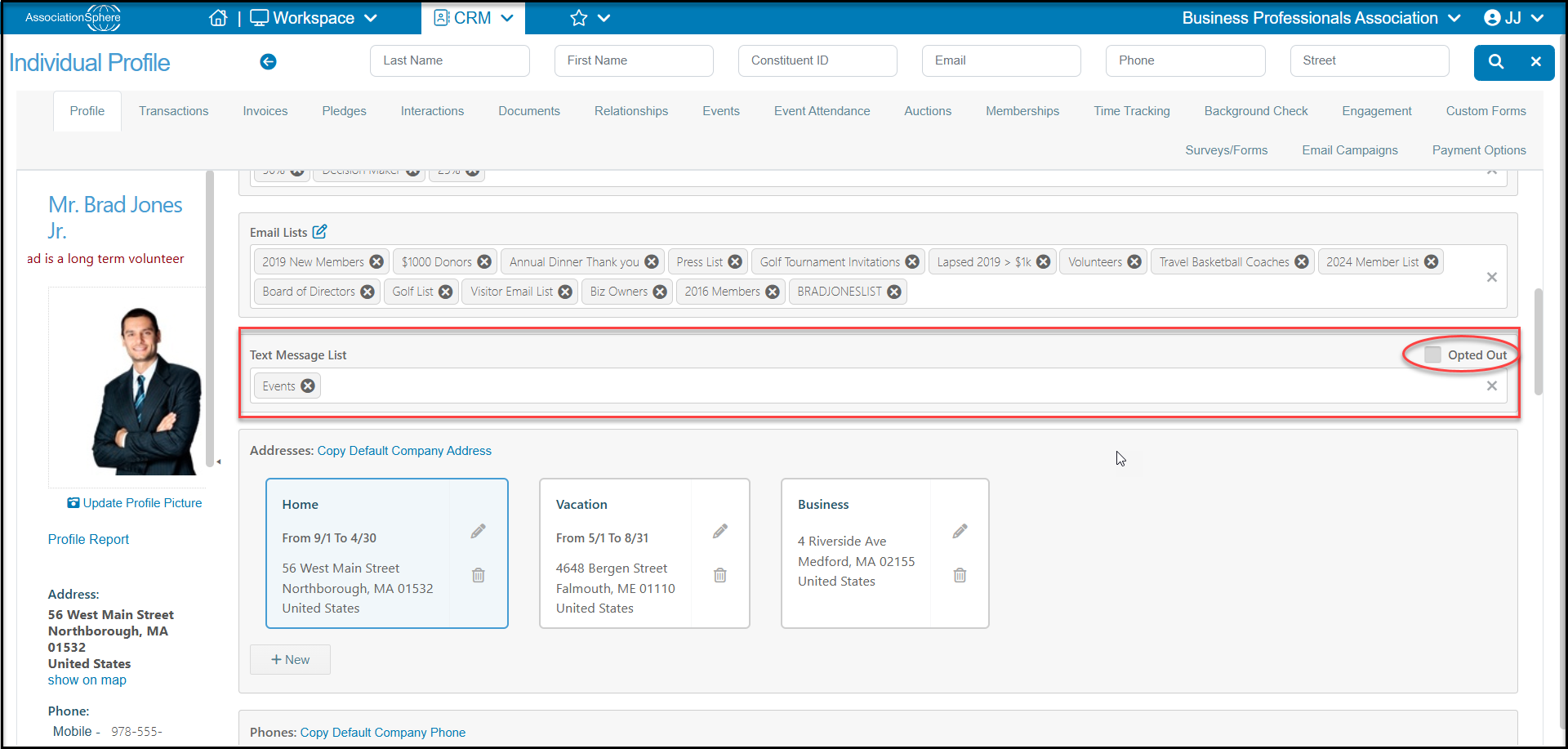 Constituents can opt-out of text messaging anytime by replying to a message with "stop", "stopall", "unsubscribe", "cancel", "end", or “quit.” You can see if a constituent has unsubscribed from text messaging from their profile page. There will be a checkmark in the Opted Out box. This field as well as the date the constituent opted-out are also available on the Constituents, Events, and Event Attendance grids.
