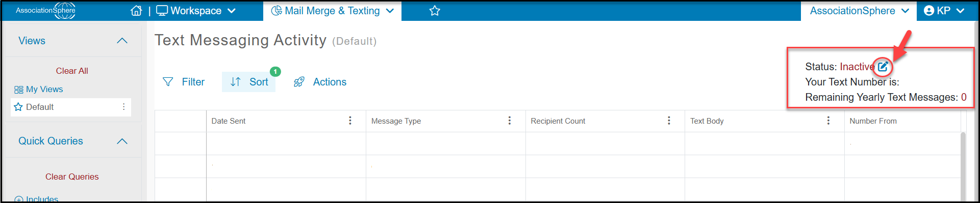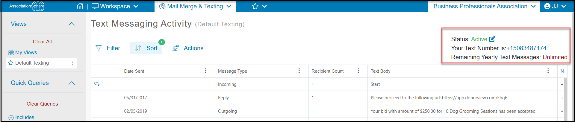 Text messaging is an optional feature with DonorView. There are several subscription levels. Activating text messaging does require an activation fee, but there are several annual plans, including a free plan. To determine what your organization's text messaging status is go to Workspace, and in the Mail Merge & Texting module, click directly on Text Messaging Activity.