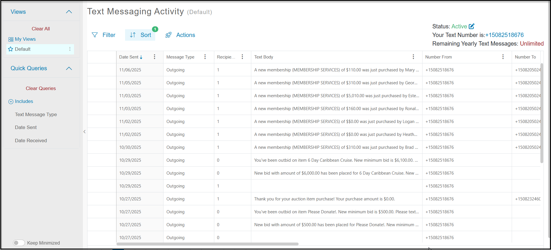 On the Text Messaging Activity grid you can see a list of all messages incoming and outgoing from the software. It has a default sort by Date Sent in Descending order showing the most recent text messages at the top of the list.