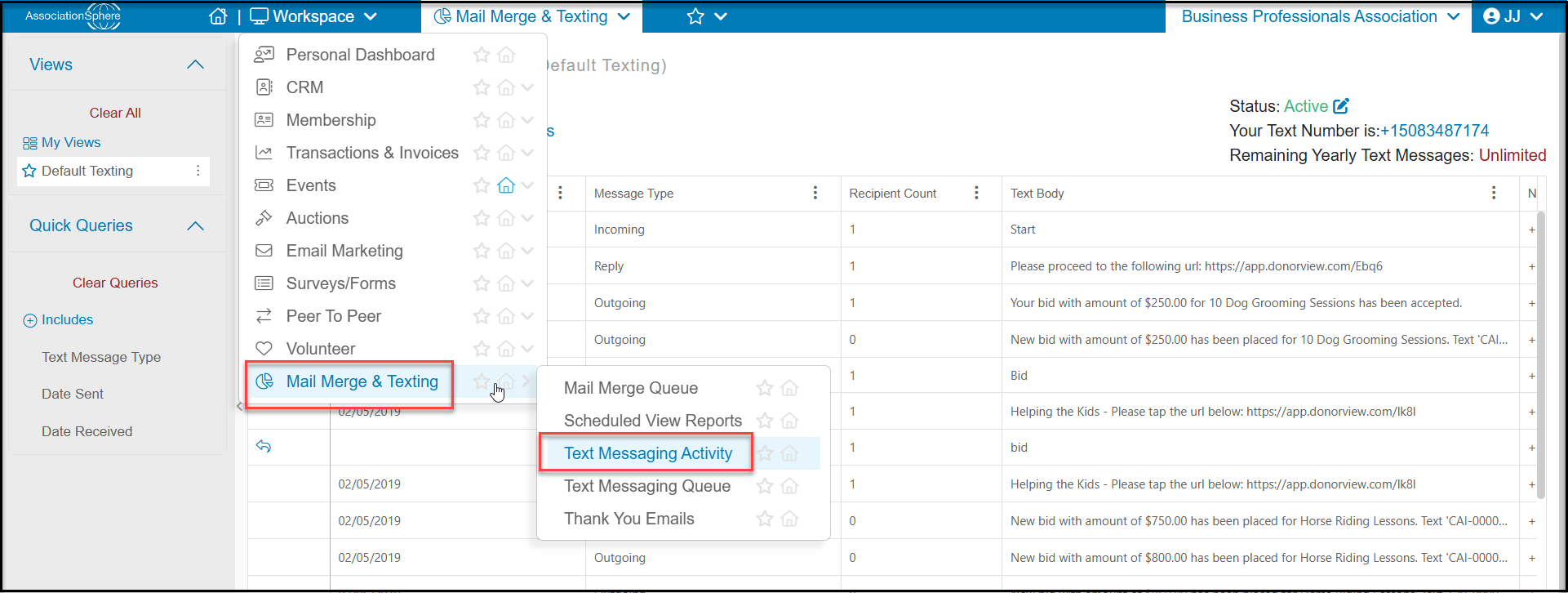To see a list of all the messages you have sent as well as incoming and automated messages, go to Workspace, Mail Merge & Textings, then click on Text Messaging Activity.