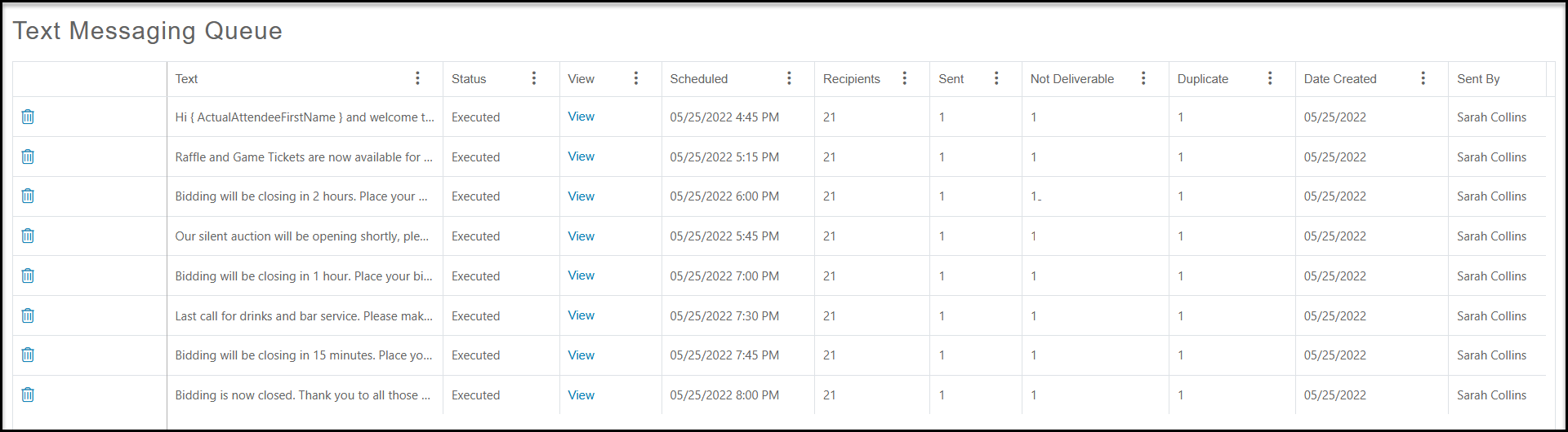 On this grid you can see the Text of the message, Status, when it was/is Scheduled, as well as number of Recipients.