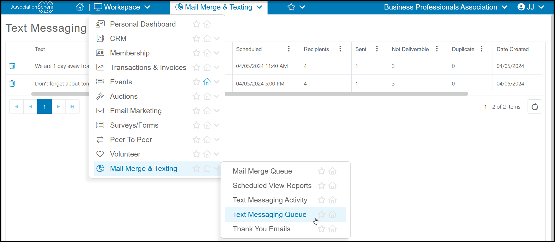 For scheduled text messages, you can see their status by going to Workspace, Mail Merge & Texting, then clicking on Text Messaging Queue.