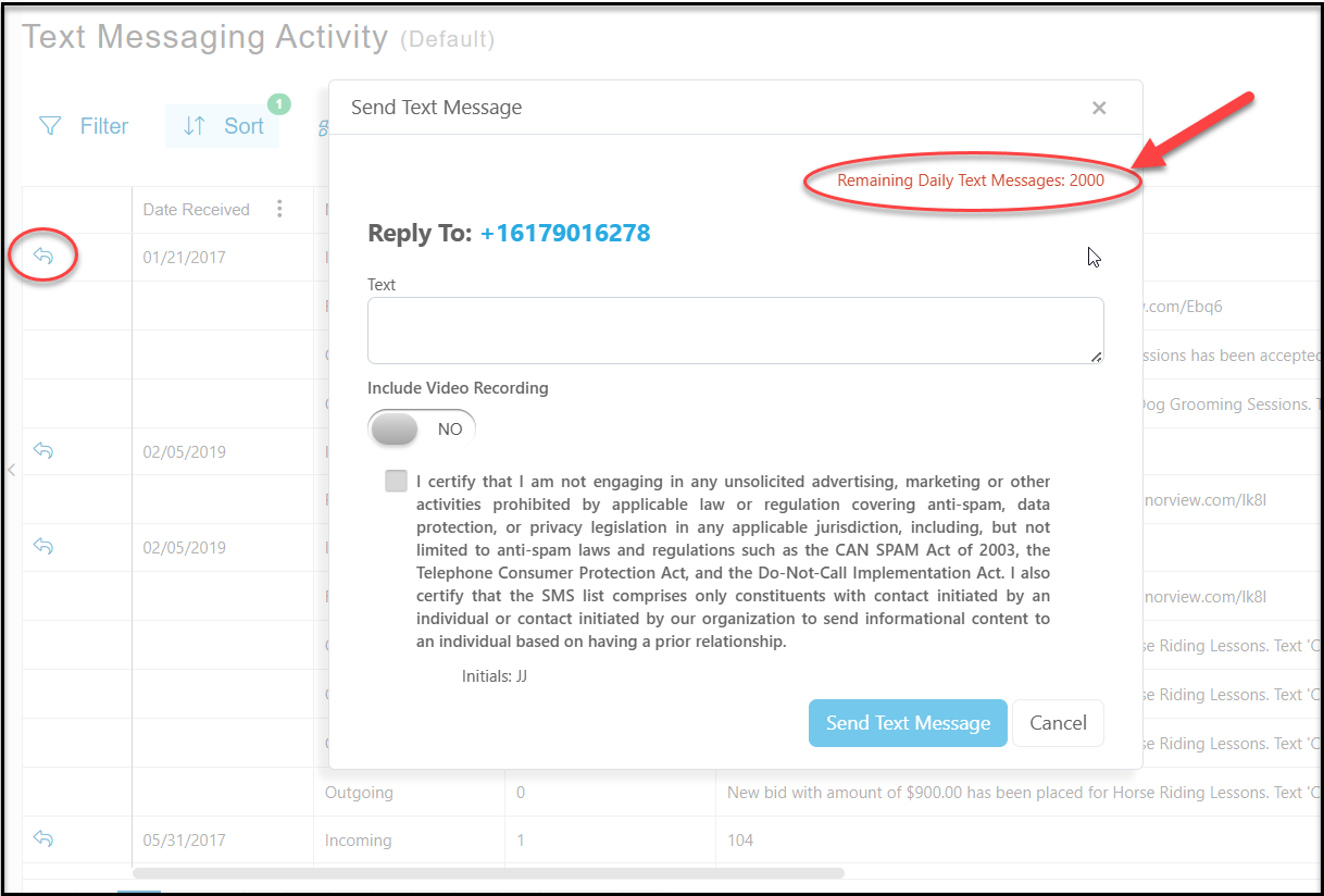 Go to the Text Messaging Activity grid. Click on the reply arrow for any message to open a new message and show the total number of Remaining Daily Text Messages. This number must be MORE than the number of constituents you are trying to send a text message to.