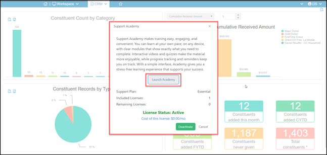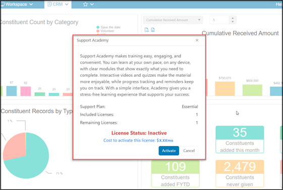 If your AssociationSphere login information is not already assigned to a support academy user license, you will see an option to click the blue button to activate it. Depending on your organization’s support plan, there may be a cost associated with getting your support academy user license.