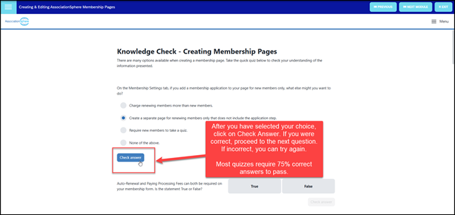 - Most quizzes require a 75% to pass and proceed to the next lesson module.