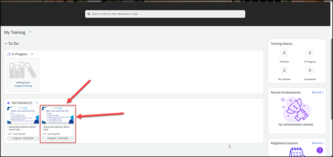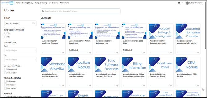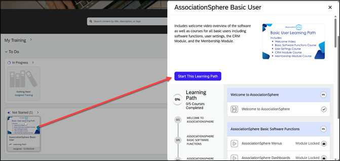 - All AssociationSphere users are assigned to the Basic User Learning Path. This learning path consists of a welcome video which is an overview of AssociationSphere and three courses to learn the basic operations and the main database module, the Constituent Relationship Management (CRM) Module.
