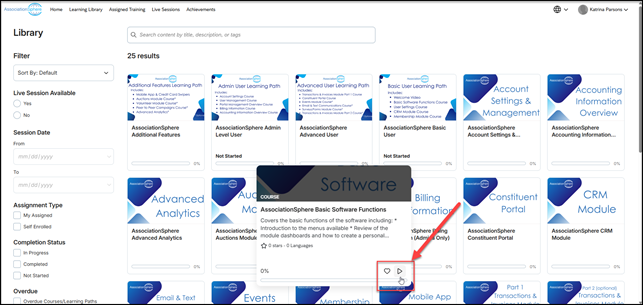 Clicking on a particular class or learning path will open a small pop up to add the class to your Favorites list or click the play arrow to open more details about the course or start the course.