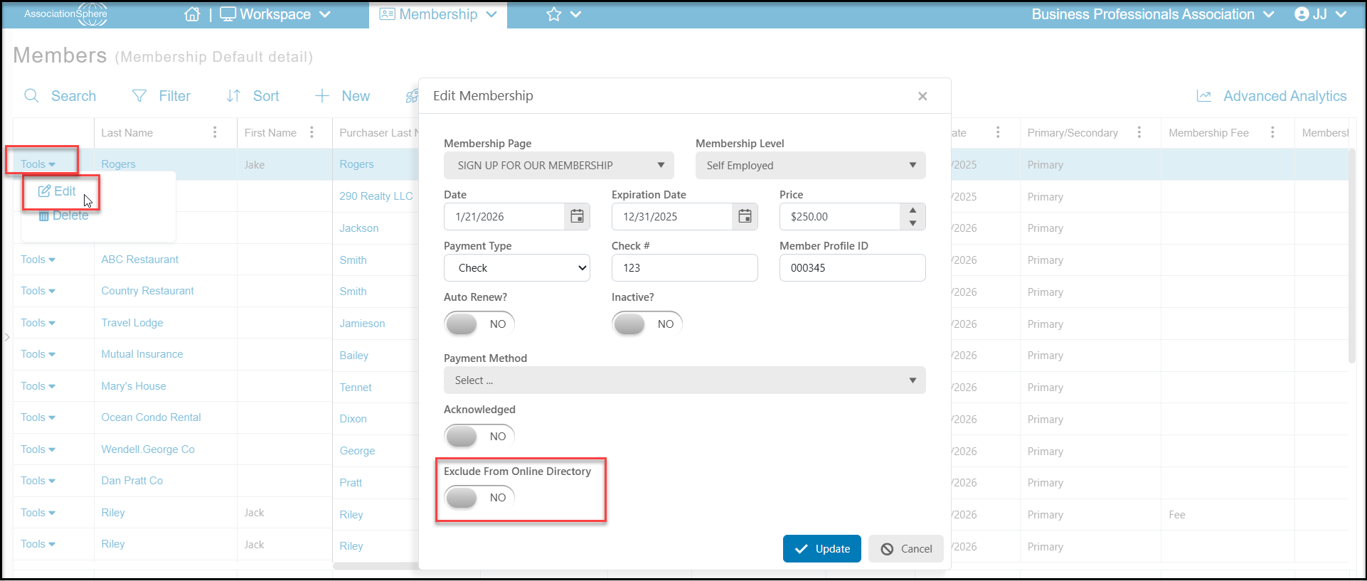 Individuals can also be excluded on a case-by-case basis by using the Tools menu from the Details View. Find the member, click on Tools, then Edit. In the new window toggle Exclude From Only Directory to YES and click Update to save the changes.