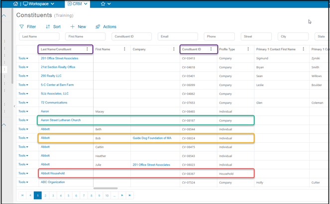 On some grids and fields, you will see the Last Name/Constituent used interchangeably with Last Name. Whenever you see “Last Name” know that it may contain the last name of a person, the name of an organization, business, or company, or the name of a household.
