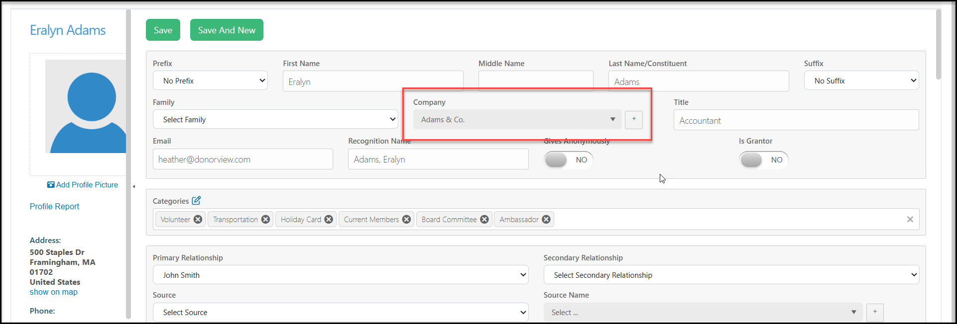 There is also a field associated with individual constituent records called Company (outlined in purple below.) This field represents the name of the company record that an individual record is related to with an employer-employee relationship. You can think of the Company field as employer. It will only show data when the name of the individual's employer is connected to their record. In the example below, Eralyn Adams works for Adams & Co (shown outlined in gold below.) Adams & Co. also have their own record in the database (shown outlined in green below.)