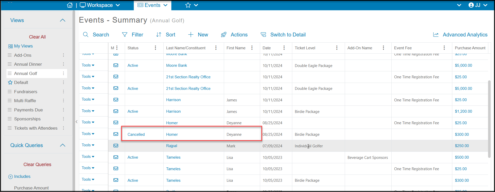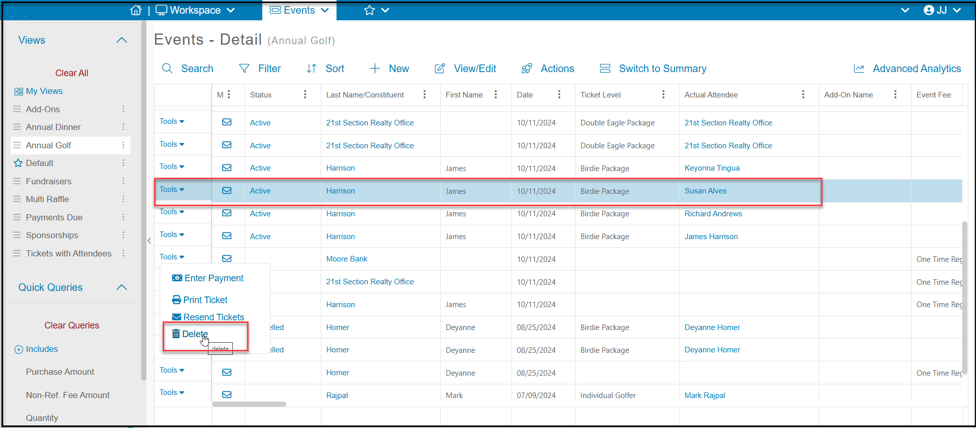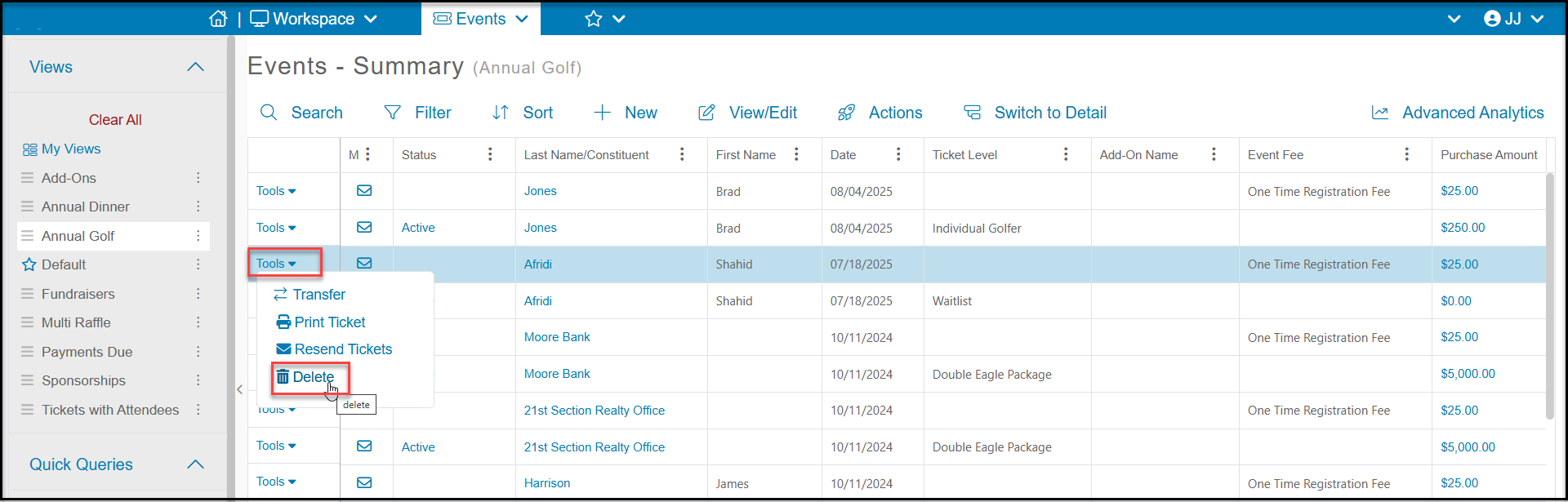 1. To delete the entire purchase, locate the constituent's name on the Events - Summary grid.