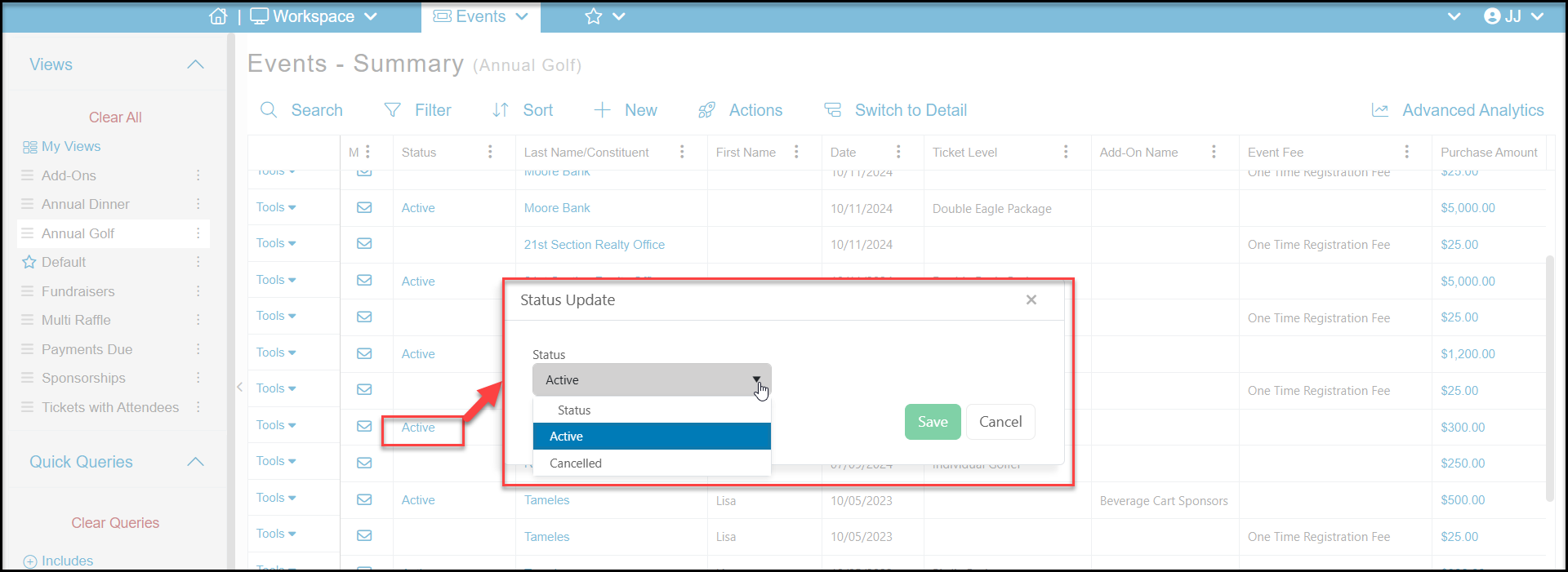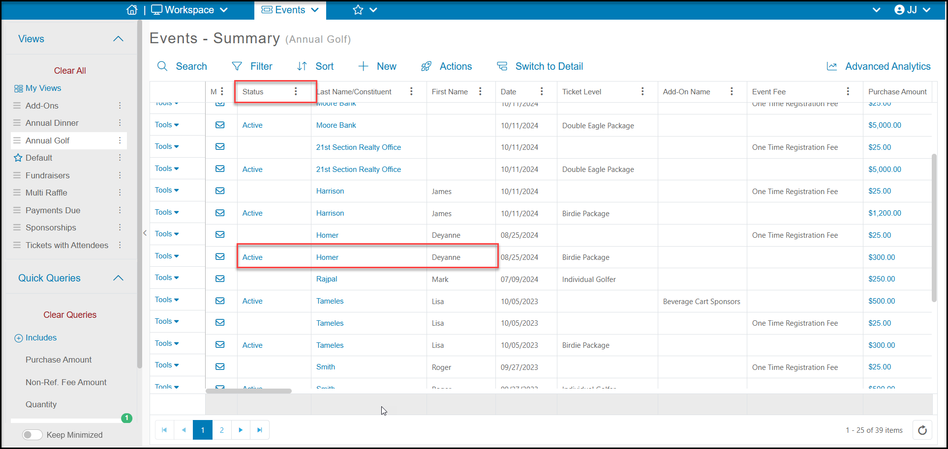 1. To keep the transaction showing on the Events grid, but update the purchase to show that the attendees are not attending, locate the Status column on your Events grid.