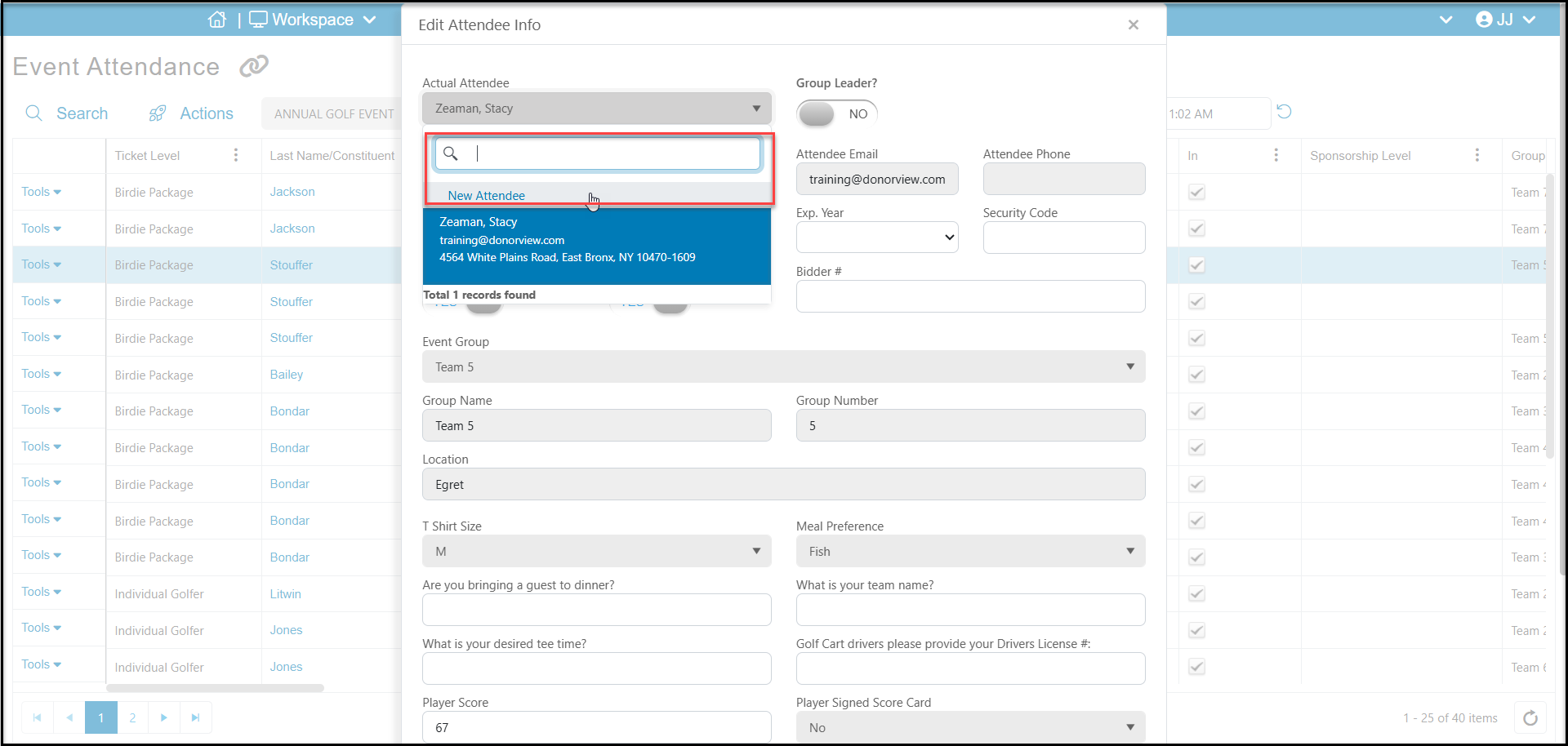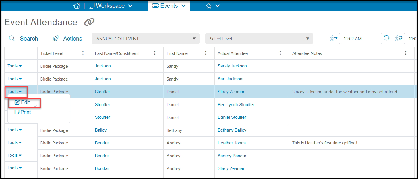 If you do not wish to change the Events grid information, you can either edit the actual attendee name or add a note to the record on the Event Attendance grid.