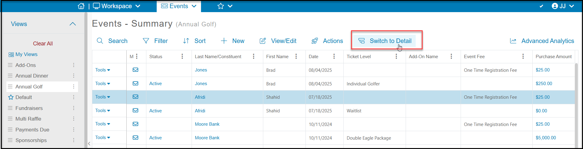6. Click on Switch to Detail at the top of the Events - Summary grid.