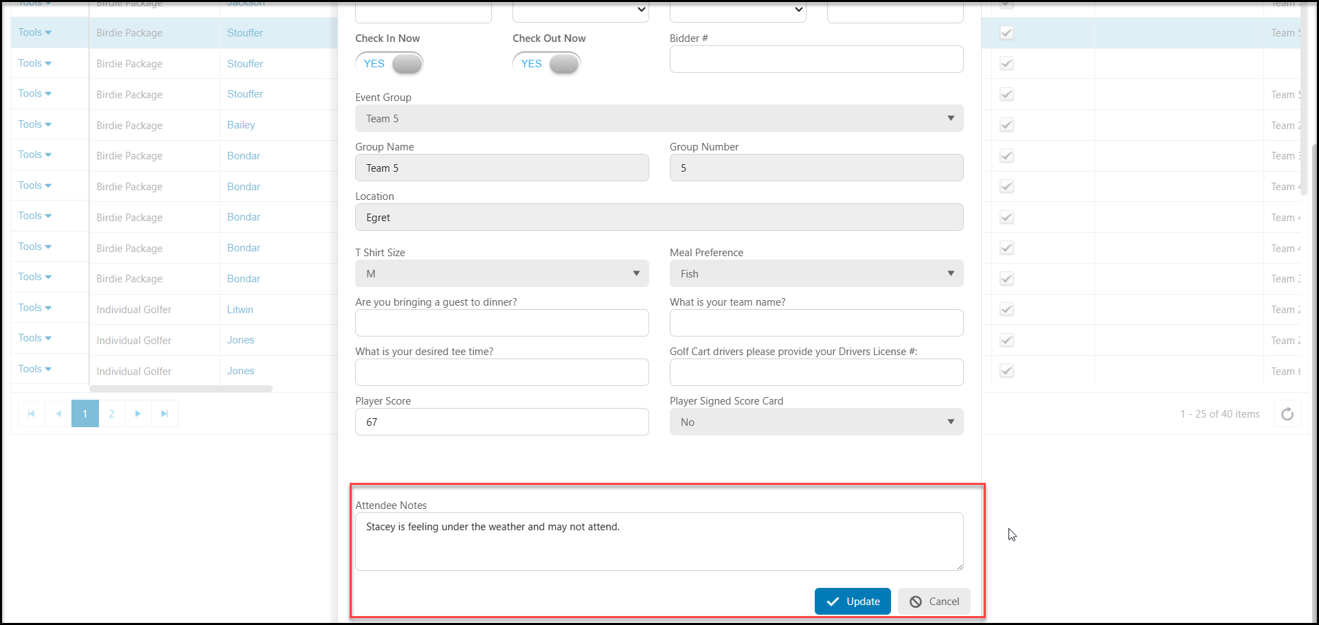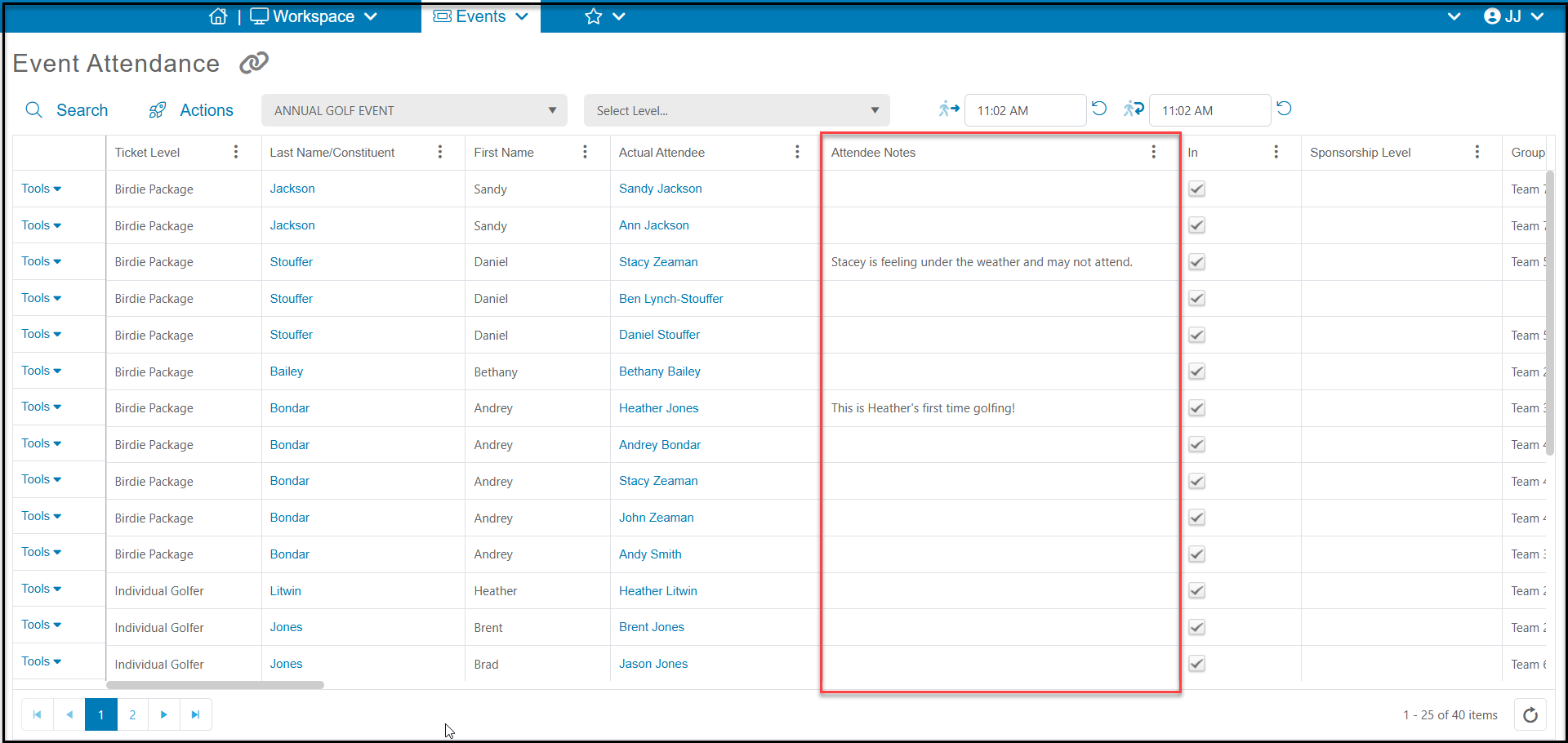 1. On the Event Attendance grid, locate the Attendee Notes column.
