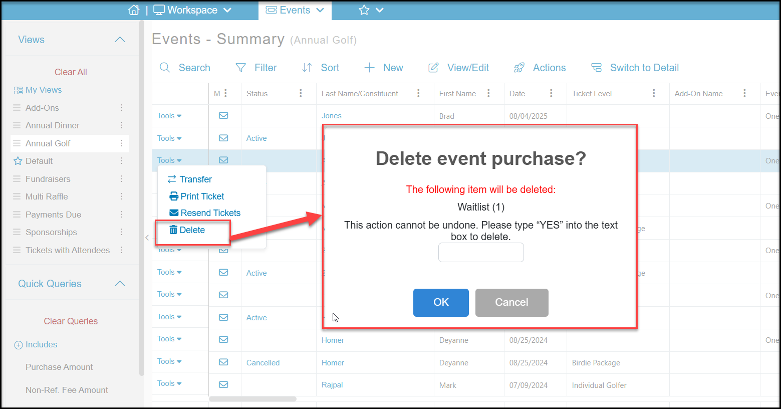 4. This will delete the entire transaction, the names will be removed from the Event Attendance grid, and the tickets will be available for purchase again.